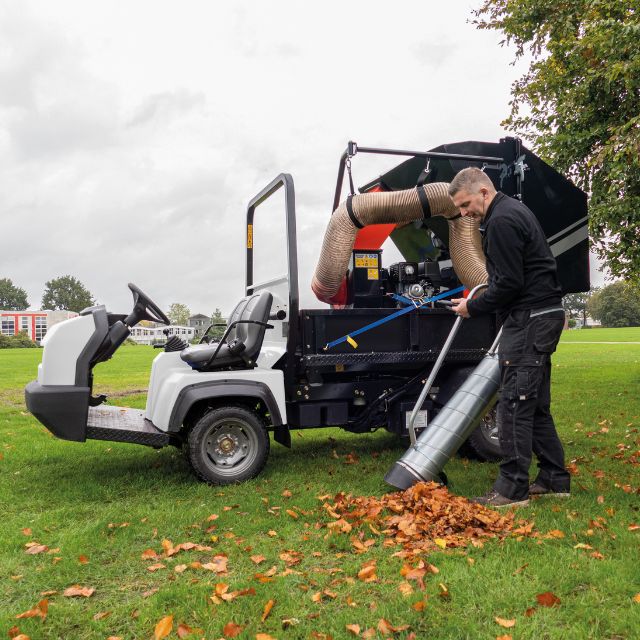 Debris loader T1 with hopper is TRILO’s unique concept to adapt smaller vehicles into a small vacuum sweepers. Such as UTV’s (utility vehicles), pick-up trucks or trikes. Ideal for mobile removal of waste materials from the most hard-to-reach places. Now made easy with the TRILO T1. You can easily mount the T1 onto a loading bed, and it is then immediately ready for use. With this mini-unit, you effortlessly vacuum a load volume of one cubic meter of litter, pruning residue or leaves with a five-meter suction hose. This debris loader is easy to operate and requires little maintenance. The machine is not only ideal for use on narrow roads, urban areas, camping sites, cemeteries, parks, and golf courses, but it is also excellent for use during events!